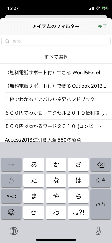 [フィルター]ボタンをタップし、[並べ替えとフィルター]の[アイテムのフィルター]を選択して、検索ボックスにキーワードを入力します。