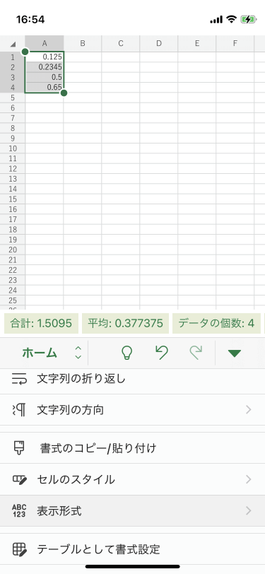 [リボンを開く]をタップし、[ホーム]タブの[表示形式]オプションから[パーセンテージ]を選択します。ただし、小数点第3位で四捨五入された結果になります。