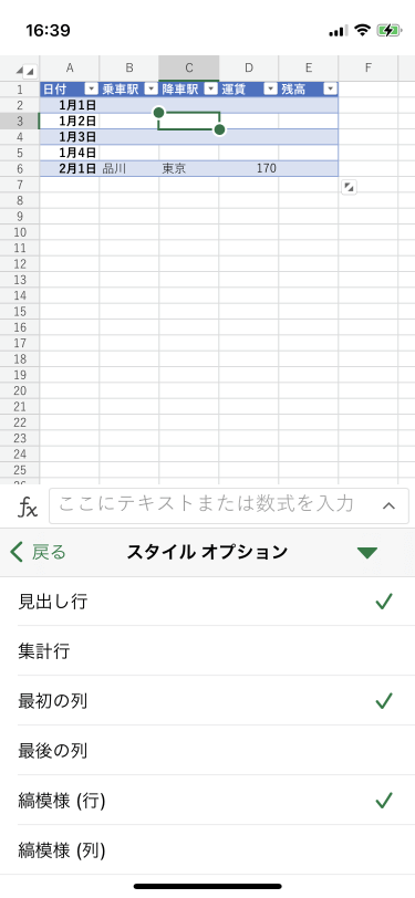 - [テーブル]タブの[スタイルオプション]をタップします。