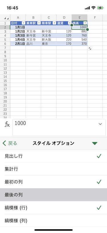 Excel for iPhoneで最初の列や最後の列を見出しスタイルにするには、テーブル内にカーソルを移動して[テーブル]タブを開き、[スタイルのオプション]一覧から[最初の列]や[最後の列]にチェックを付けます。