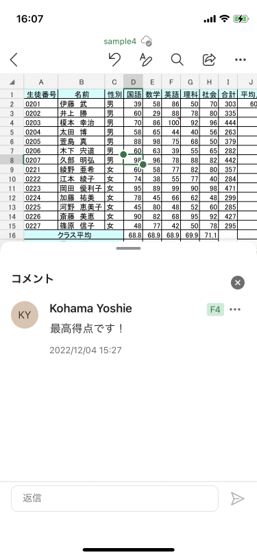 アイコンをタップします。なお、作業中のシートのコメントを確認するには、[レビュー]タブの[コメントの表示]を選択します。