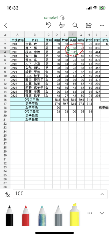 Excel for iPhoneでのペンは、ペンと蛍光ペン、鉛筆の3種類が用意されています。ペンの種類を変更するには、描画ツール一覧から変更したいペンを選択します。