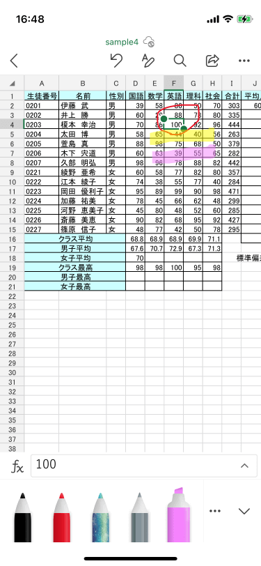 Excel for iPhoneではインクの色を自由に変更できます。対象となるペンを選択し、[その他の書式設定]一覧から変更したい色を選択します。一覧にない場合は[その他のインクの色]一覧から選択します。