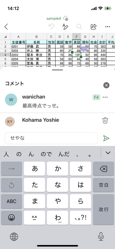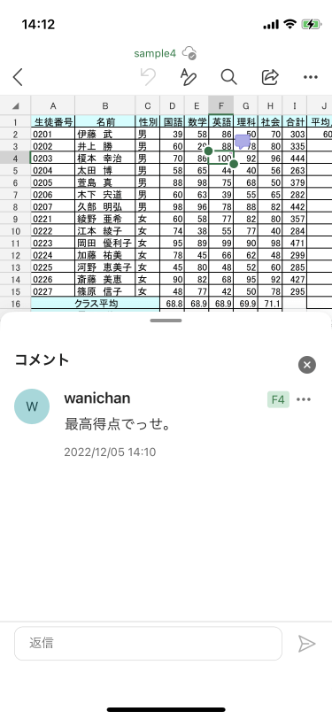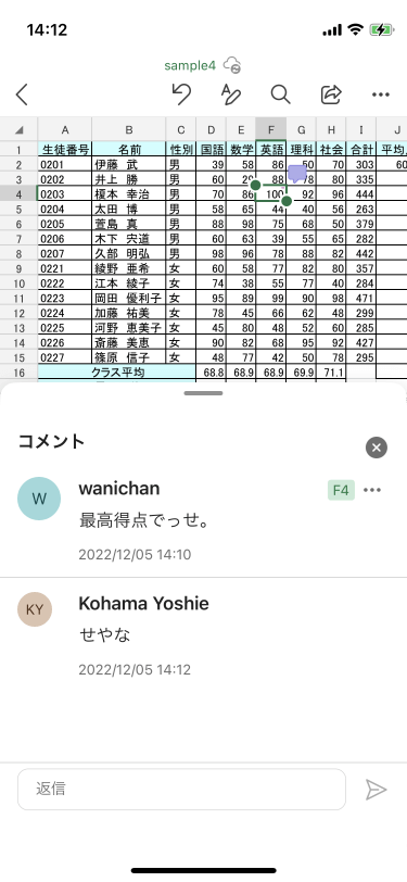 コメントウィンドウから該当のスレッドの下に返信ボックスがあるので、そこに返信メッセージを入力し、紙飛行機アイコンの[送信]ボタンをタップします。