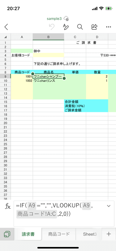 =IF(A9="","",VLOOKUP(A9,商品コード!A:C,2,0))