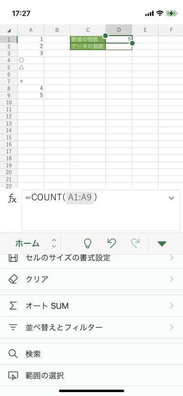 数値と文字列の混合したセル範囲のうち、数値の入ったセルの個数を数えるには、COUNT関数を利用します。Excel for iPhoneで[オートSUM]をタップし、オートSUM一覧から[数値の個数]を選択して、対象となるセル範囲を指定します。