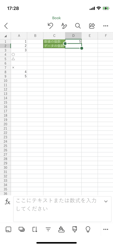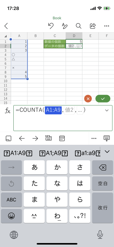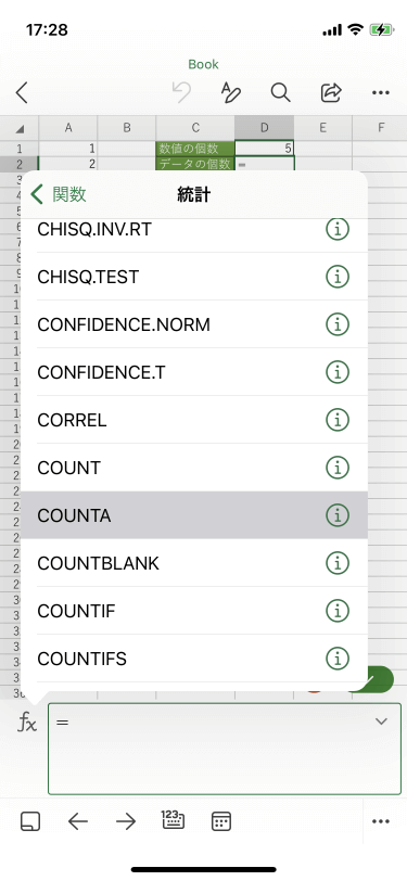 [関数の挿入]をタップし、一覧から[統計関数]を選択し、COUNTAを選択して、関数の引数として対象セル範囲を指定します。