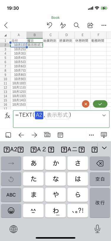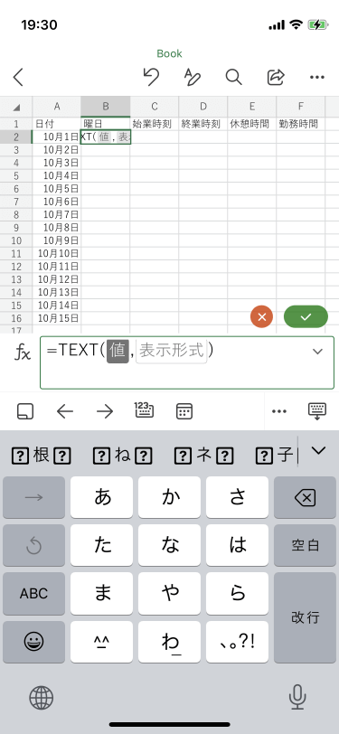 日付が入ったセルの隣にそれに対応する曜日を求めるには、TEXT関数を利用します。表示形式には”(ダブルクォーテーション)で括ります。ここでは、Excel for iPhoneで日付に対応した曜日を1文字で表示する方法について説明します。