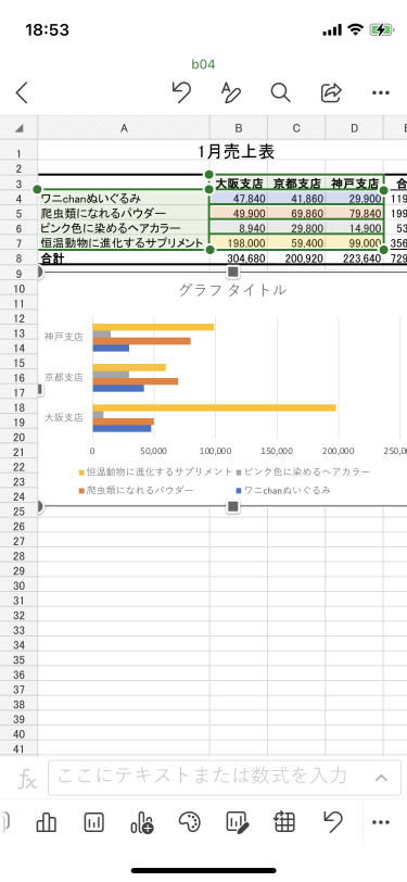 Excel for iPhoneでグラフのデータ範囲の大きさを変更するには、グラフを選択して、元データ範囲の右下隅をドラッグするとOKです。残念ながら、iPhoneからは連続しないデータ範囲を選択することができないので、グラフに不要な行や列を非表示にするとOKです。