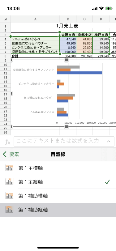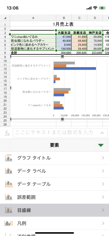 プロットエリアに補助目盛線を引くには、グラフを選択して画面下部のツールバーから[要素]ボタンをタップするか、画面右上の