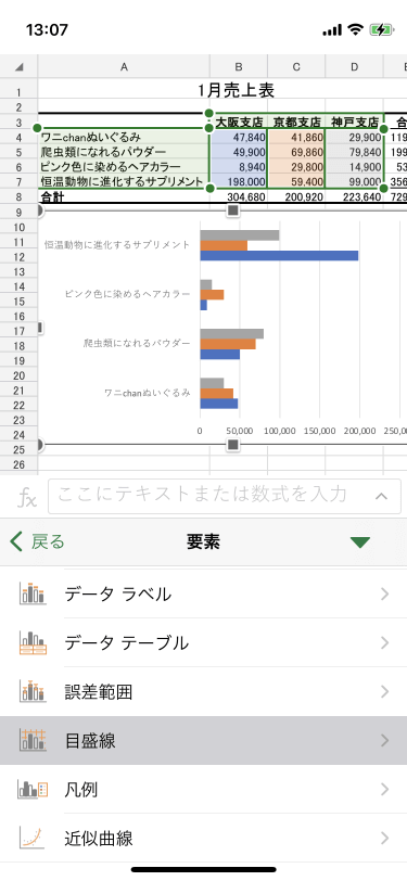 - グラフを選択して画面下部のツールバーから[要素]ボタンをタップします。