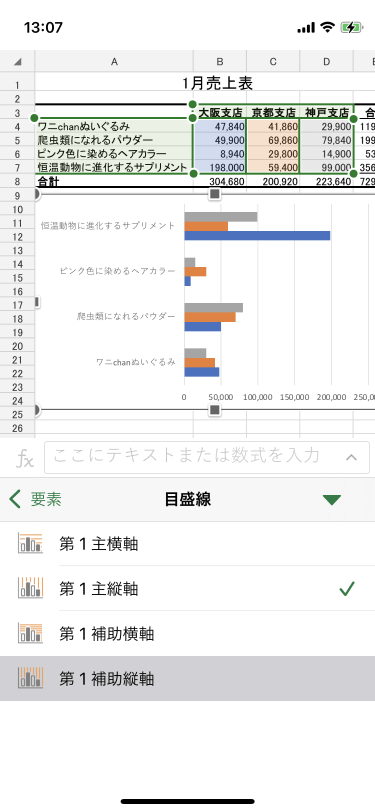 [リボンを開く]をタップして[グラフ]タブを開き、[要素]一覧より[目盛線]を選択して[第一補助縦軸]または[第一補助横軸]を選択します。