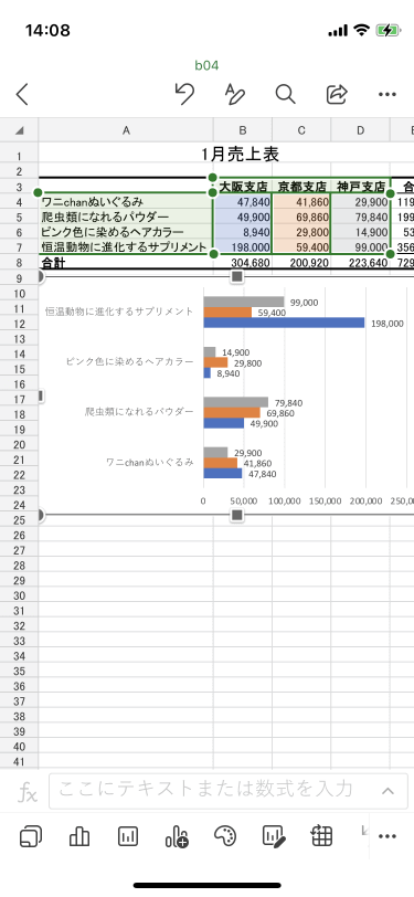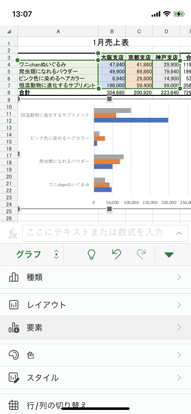 - グラフを選択して画面下部のツールバーから[要素]ボタンをタップします。