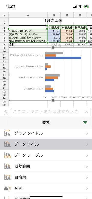 グラフのそれぞれのデータにラベルを付けるには、グラフを選択して画面下部のツールバーから[要素]ボタンをタップするか、画面右上の