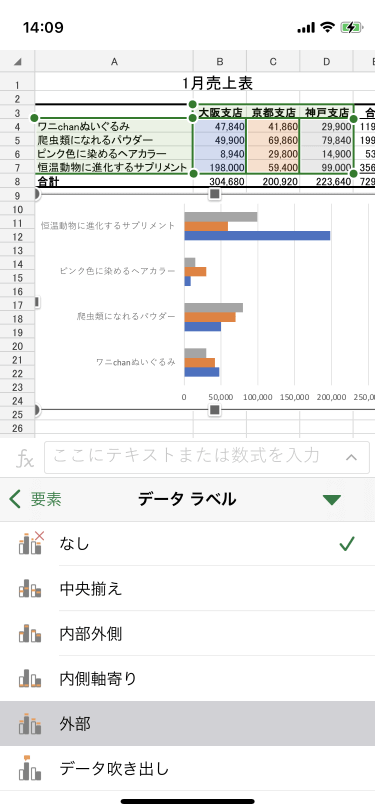 [リボンを開く]をタップして[グラフ]タブを開き、[要素]の[データラベル]一覧から配置方法(中央・内側・内側軸より・外部・データ吹き出し)を選択します。