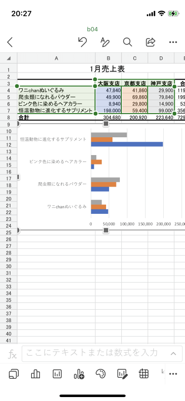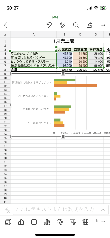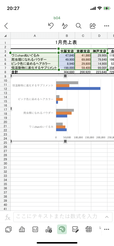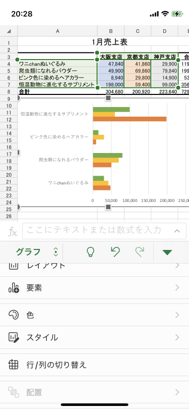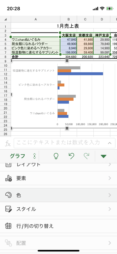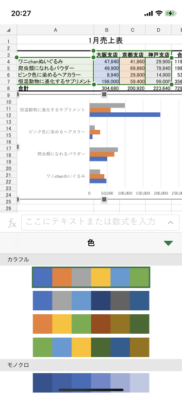 白黒印刷でもグラフの各要素の区別を明確にするために、配色を後で変更することができます。グラフを選択して画面下部のツールバーから[色]をタップするか、画面右上の