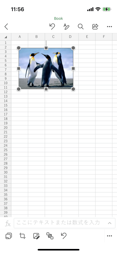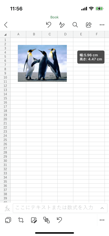 Excel for iPhoneでワークシート上に挿入した図を選択すると、サイズ変更できるハンドルが表示されます。右下の丸いハンドルを使ってサイズを調整できます。