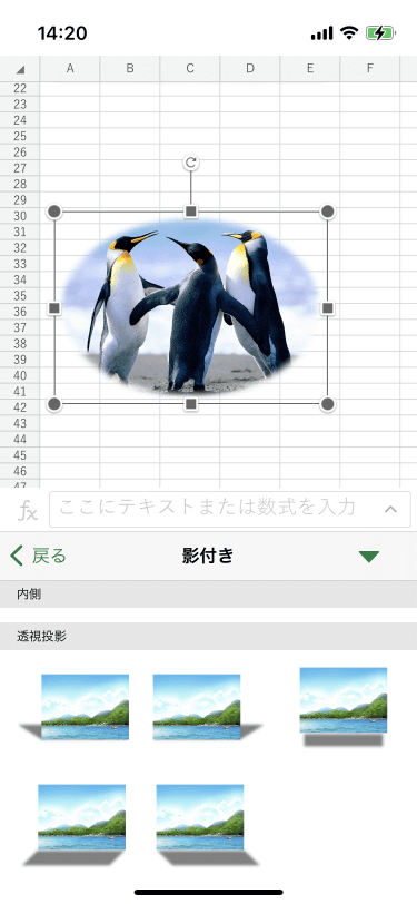 [リボンを開く]をタップして[画像]タブを開き、[影付き]コマンドから適用したいスタイルを選択します。視覚的スタイルと影付き効果を組み合わせて適用できます。