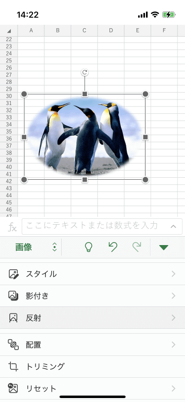 [リボンを開く]をタップして[画像]タブを開き、[反射]コマンドから適用したい反射の種類を選択します。視覚的スタイルや影付き効果等と組み合わせて適用できます。