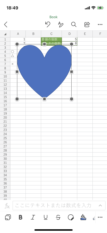 挿入された図形にはサイズ変更や回転ハンドルが表示されます。Excel for iPhoneでサイズ変更ハンドルを使って図形のサイズを変更できます。縦横比維持するには四隅の丸いハンドルを利用し、幅や高さだけを変えたい場合は四角のハンドルを利用します。