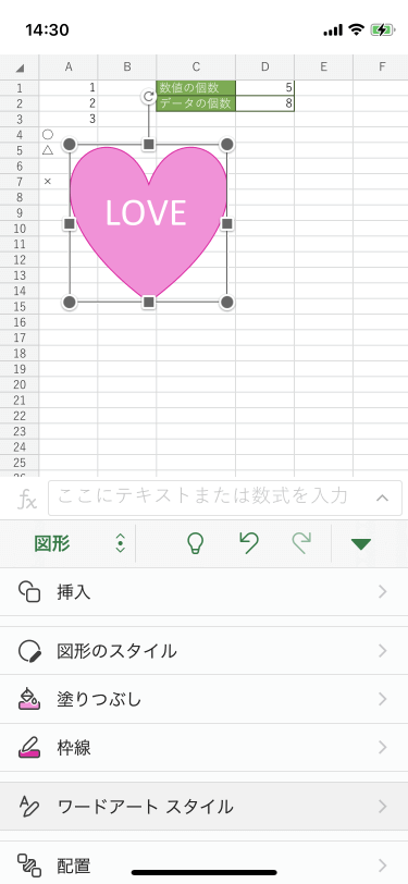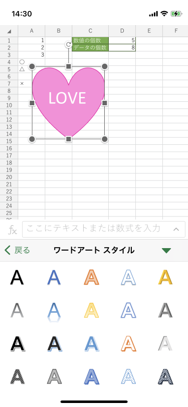 [リボンを開く]をタップして[図形]タブを開き、[ワードアートスタイル]一覧からスタイルを選択します。