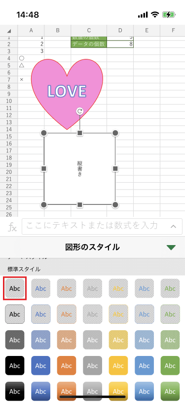 - テキストボックスを選択して画面下部のツールバーから[図形のスタイル]をタップします。
