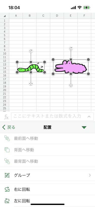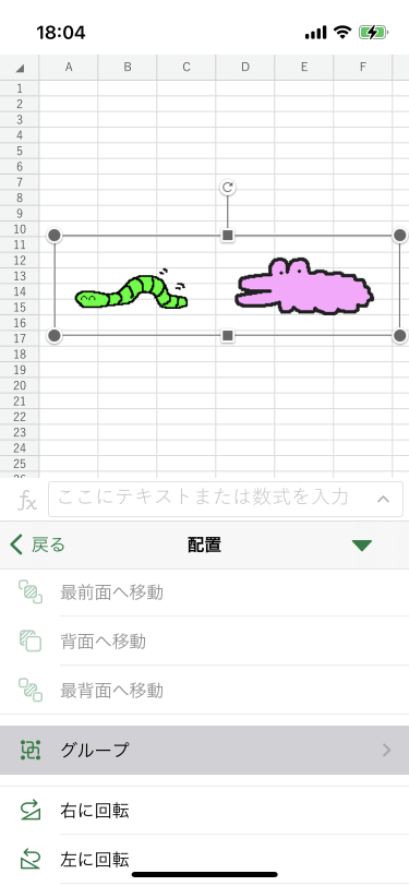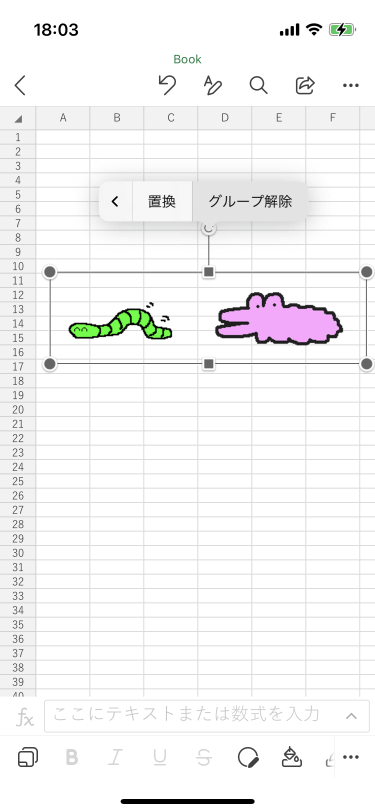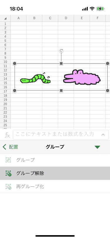 グループ化されたオブジェクトを選択し、ポップアップメニューから[グループ解除]を選択するか、画面右下の[…]をタップし、[画像]や[図形]タブの[配置]コマンド一覧から[グループ解除]を選択します。