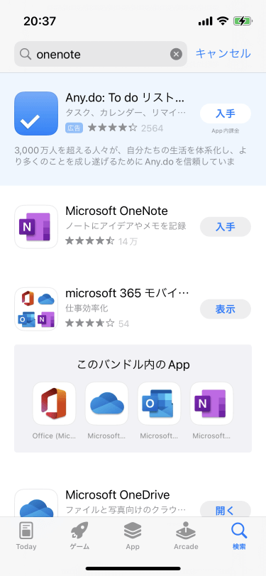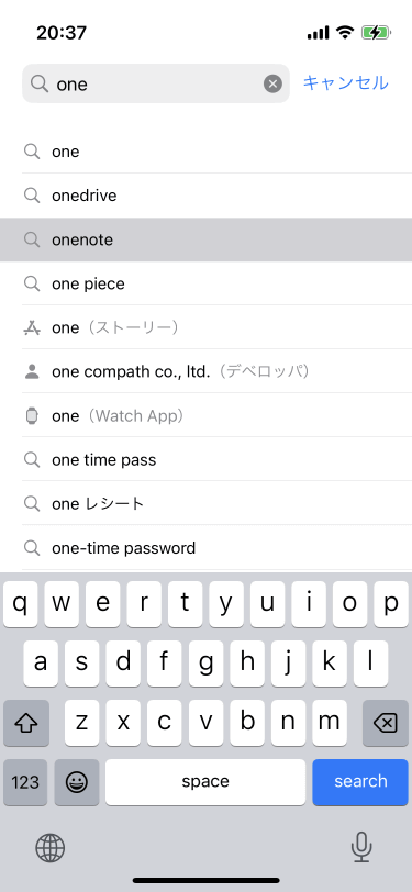 - 上の検索ボックスに「onenote」と入力すると候補が表示されるので、その候補を選択します。