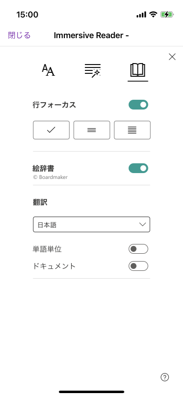 イマーシブリーダー画面の右上の三本線をタップして[閲覧の環境設定]をタップし、[行フォーカス]のスイッチをオンにして、フォーカスの行数(1・3・5)を選択します。文字間隔を狭くすることで読みやすくなります。