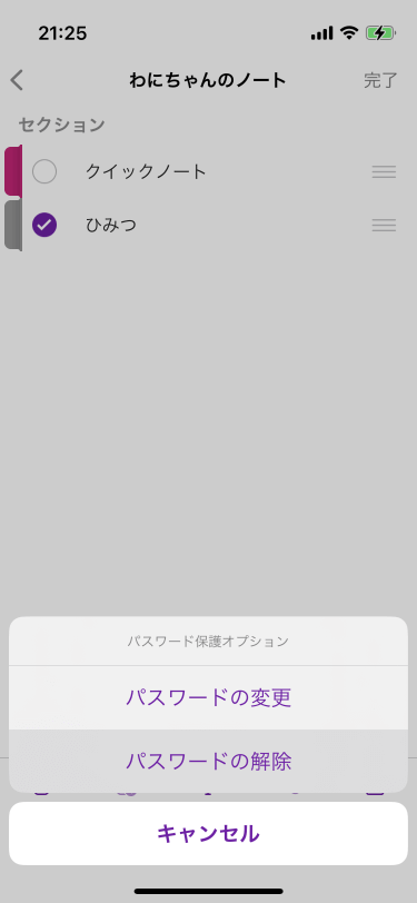 このセクションのパスワードを入力し、[解除]をタップします。