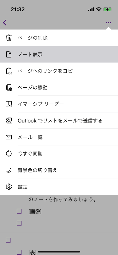 OneNote for iPhoneでリスト表示にしたページをノート表示に戻すには、画面右上の[…]をタップし、[ノート表示]を選択します。