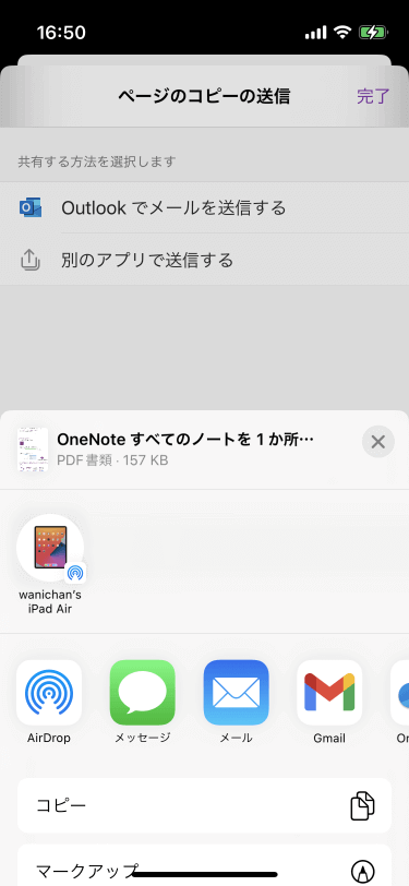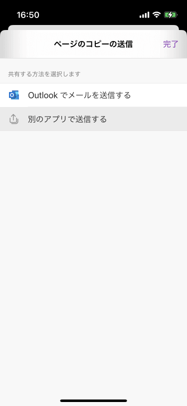現在開いているページをPDFに変換してメールに添付送信するには、画面右上の[…]をタップし、一覧から[ページのコピーの送信]を選択して、[Outlookでメールを送信する]をタップするか、[別のアプリで送信する]をタップして[メール]などの他のメーラーアプリを選択します。
