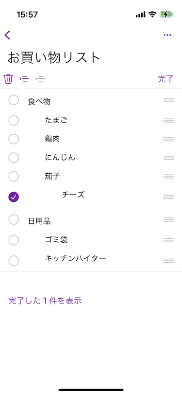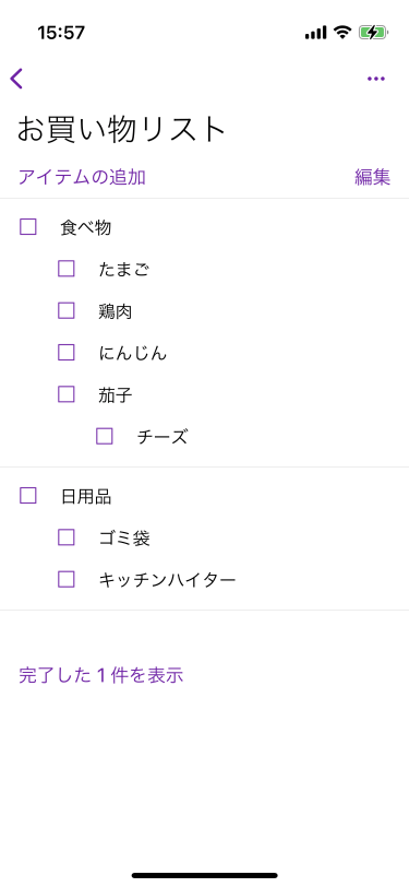 OneNote for iPhoneのリスト表示ページの右上の[編集]をタップし、削除したいアイテムにチェックを入れて、画面左上の[削除]アイコンをタップします。