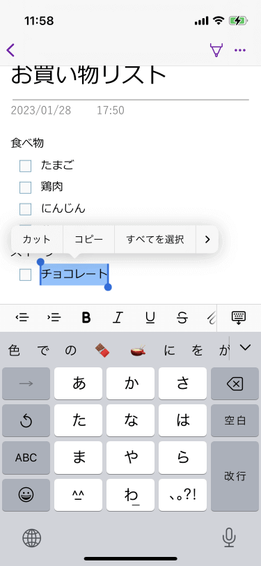 OneNote for iPhoneで太字にしたい文字を選択し、ソフトキーボード上部のツール一覧から