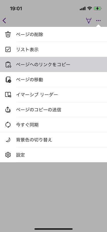 一覧から[ページへのリンクをコピー]を選択します。選択したページへのリンクとページのタイトルがクリップボードにコピーされます。