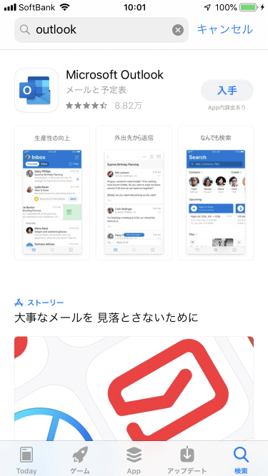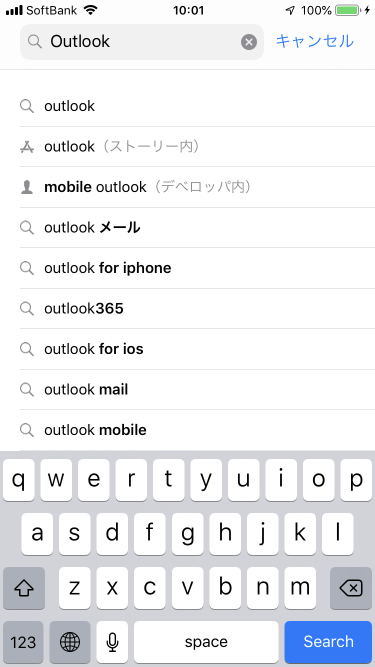 iOS 12.4 の iPhone で、 App Store から Outlookアプリを検索してインストールする方法について説明します。