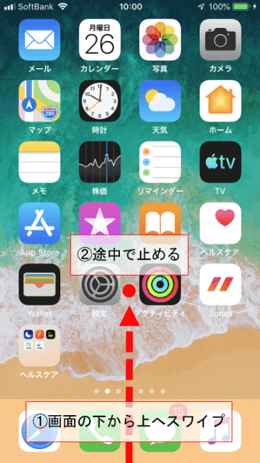 - 画面下部より上方向へスワイプ(スライド)して途中で指を止めて指を離します。