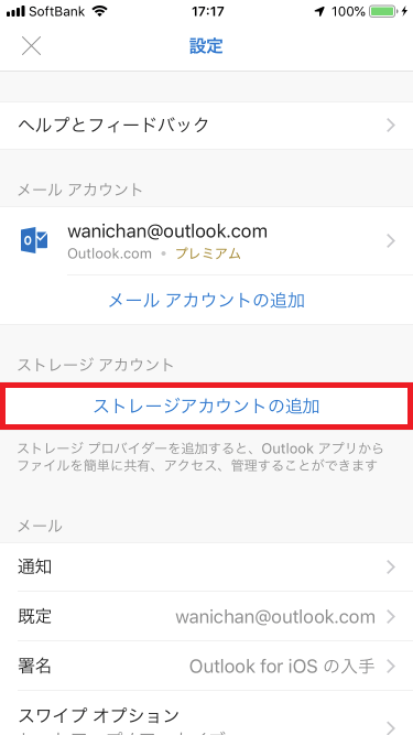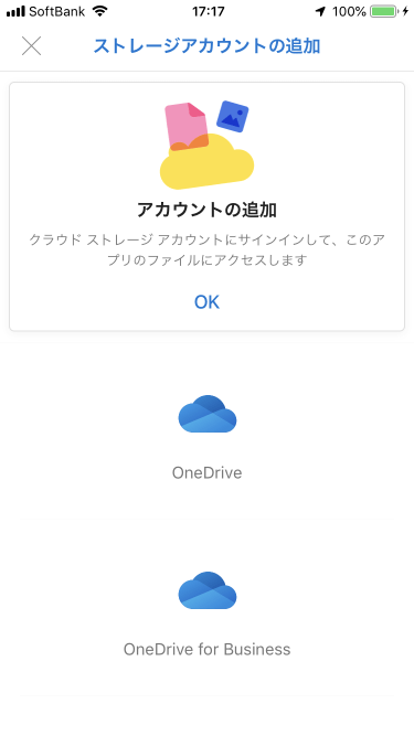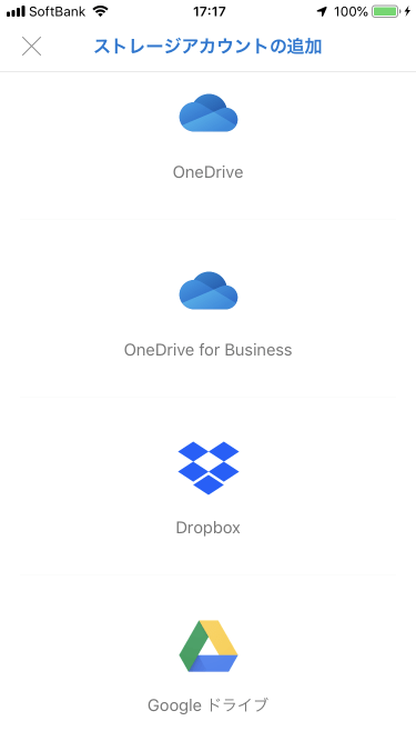 [設定]画面から[ストレージアカウントの追加]を選択して、追加したいストレージプロバイダーを選択し、ログインします。