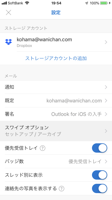 - [設定]画面の[メール]オプションから[スワイプ オプション]を選択します。