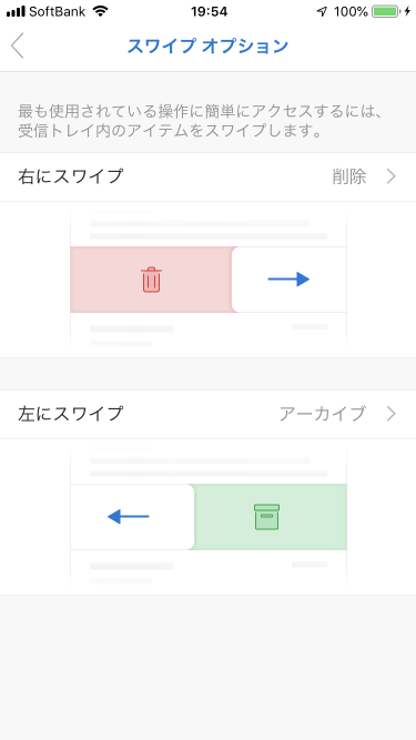 オプション]を選択します。既定では、左にスワイプするとアーカイブ、右にスワイプには何も設定されていません。そこで、[右にスワイプ]を「削除」に割り当ててみましょう。