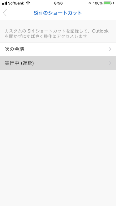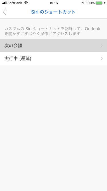 Siri のショートカット経由で、次の会議の確認や遅延を他のユーザーに知らせるクイック アクションを設定するには、メニュー一覧より