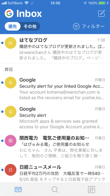 複数のメールアカウントを設定している場合、すべてのアカウントの受信トレイがマージして表示されます。個々のアカウントのビューに切り替えるには、画面左上のアカウントのアバター(ロゴ)をタップし、切り替えたいアカウントを選択します。