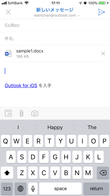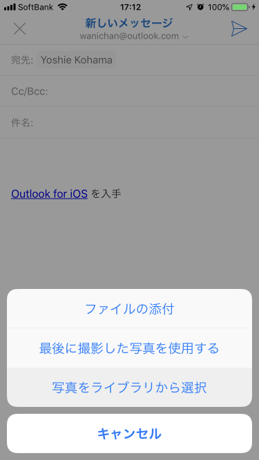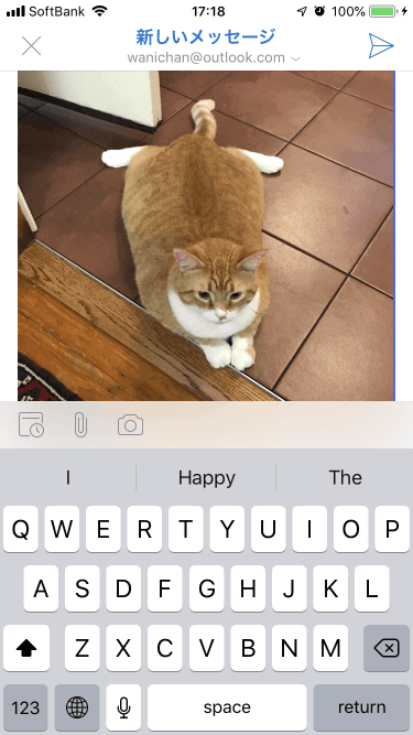Outlook for iPhoneでは、OneDrive等のストレージサービスからのファイルの添付、最後に撮影した写真、または写真をライブラリから選択してメールに添付することが可能です。ソフトキーボード上部の[添付ファイル]アイコンをタップし、それぞれ目的のファイルを指定します。