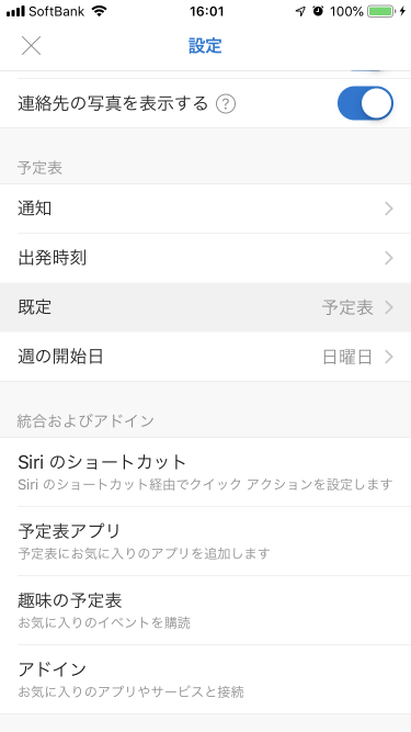 - [設定]画面の[予定表]オプションから[既定]を選択します。
