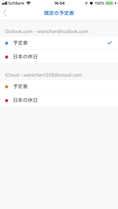複数のカレンダーアカウントと接続している場合、既定の予定表を変更することが可能です。新規予定やイベントの作成先を変更するには、メニュー一覧より