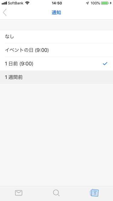 なお、終日のイベントの場合は、なし、イベント当日朝9時、前日の朝9時、1週間前の朝9時から選択できます。