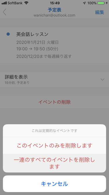任意の定期的なイベントアイテムを開き、[イベントの削除]を選択して、ポップアップメニューより[一連のすべてのイベントを削除します]を選択します。