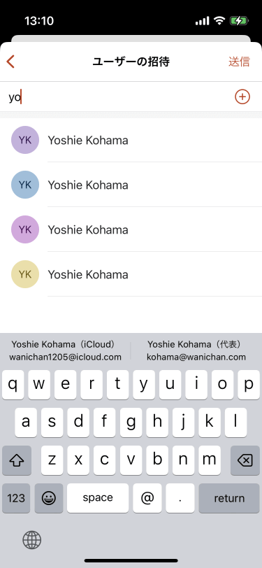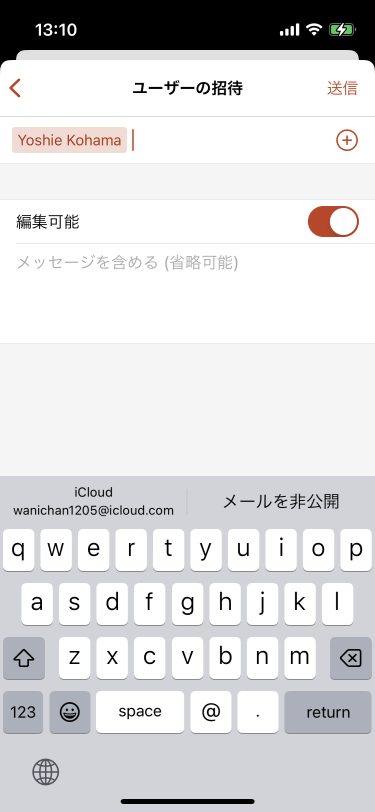 - 電子メールアドレスを入力します。もし招待する人に編集を禁止するには、[編集可能]のスイッチをオフにします。