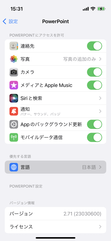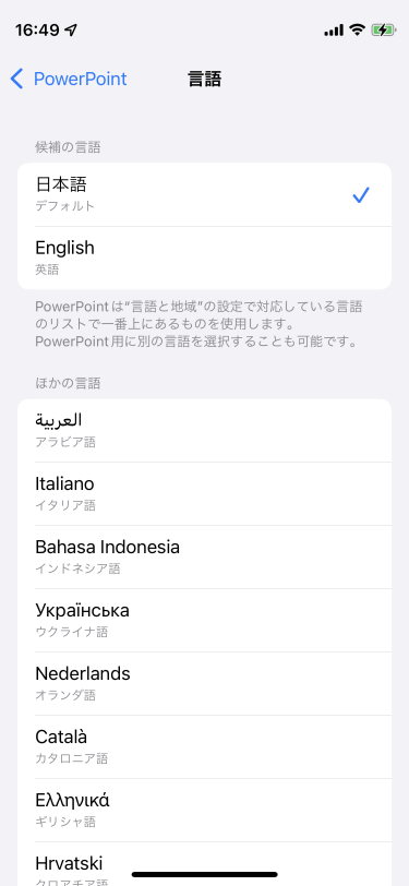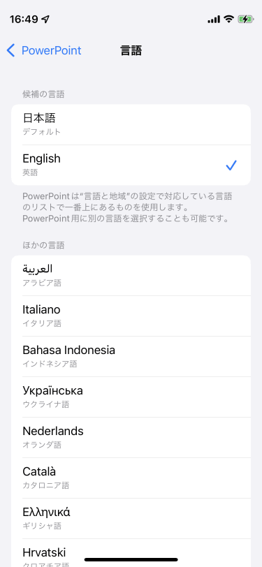 システム言語は日本語のままで、PowerPointアプリ上で別の言語で使用できます。[設定]から[PowerPoint]をタップし、[言語]を選択して、一覧から変更したい言語を選択します。