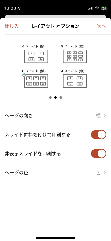 - 非表示スライドを印刷しない場合は「非表示スライドを印刷する」のスイッチをオフにして「次へ]をタップします。